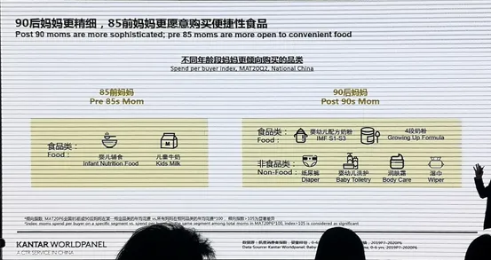 其中最为明显的变化是,90后妈妈整体的需求是往更加细分化、专业化,甚至是全方位的成分化的方向发展。她们不仅在吃上面花钱,在非食品上如婴儿洗护、湿巾、润肤露等产品深受90后妈妈的欢迎。而85前的妈妈更愿意购买便捷性食品,同时要满足高端需求,如有机奶粉、有机辅食等。
