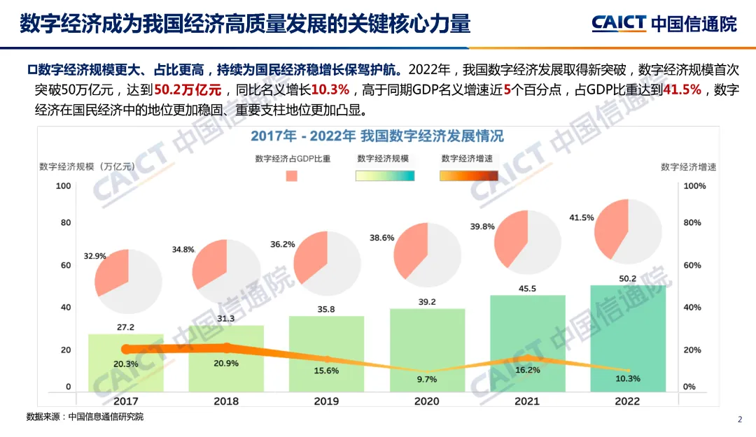 1. 据测算,我国数字经济进一步实现量的合理增长。2022年,我国数字经济规模达到50.2万亿元,同比名义增长10.3%,已连续11年显著高于同期GDP名义增速,数字经济占GDP比重相当于第二产业占国民经济的比重,达到41.5%。