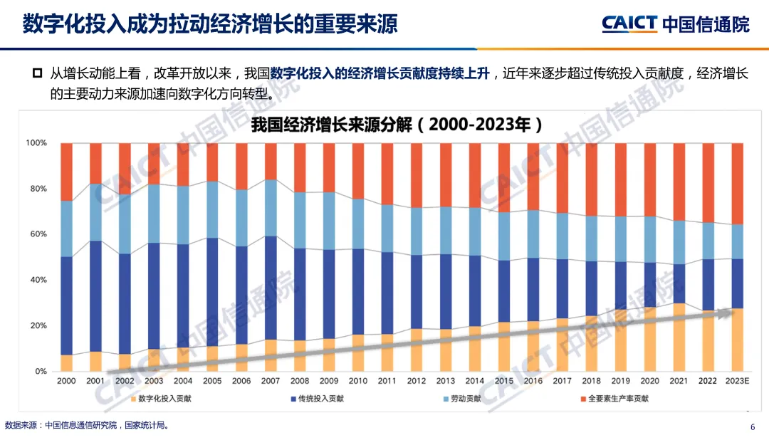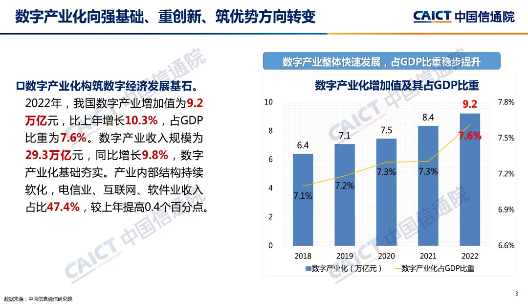 这是中国信通院连续第九年发布中国数字经济发展研究报告,2023年报告在延续以往对我国数字经济发展最新态势量化分析的基础上,首次研究了我国数字经济发展效率水平,为推动数字经济发展提供更多参考。数据为研究成果,以政府口径为准。