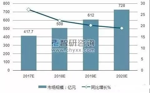 2017-2020E 中国婴儿纸尿裤市场规模及增速(亿元)