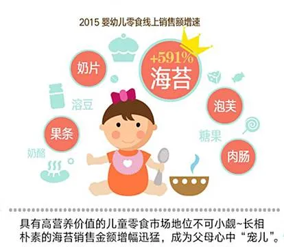 婴童食品中,零食做为必不可少的一环,营养品以零食形式的呈现,根据报告显示,具有高营养价值的儿童零食市场地位也是不可小觑。其中,海苔以最迅猛销售增幅,成为父母心中“宠儿”,随后是奶片、泡芙、果条与肉肠。