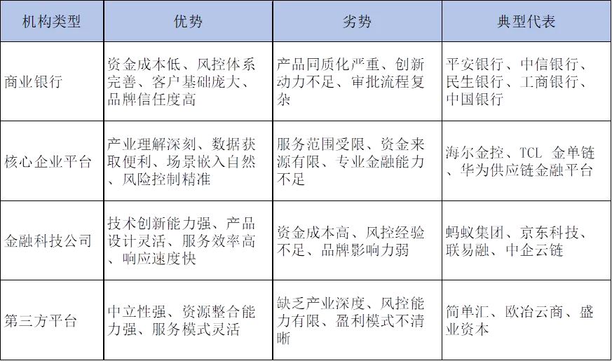 差异化竞争明显。不同类型机构形成了差异化的竞争优势。银行系机构在资金成本、风控体系、客户基础等方面具有优势;核心企业平台在产业理解、数据获取、场景嵌入等方面领先;金融科技公司在技术创新、产品设计、服务效率等方面突出。
