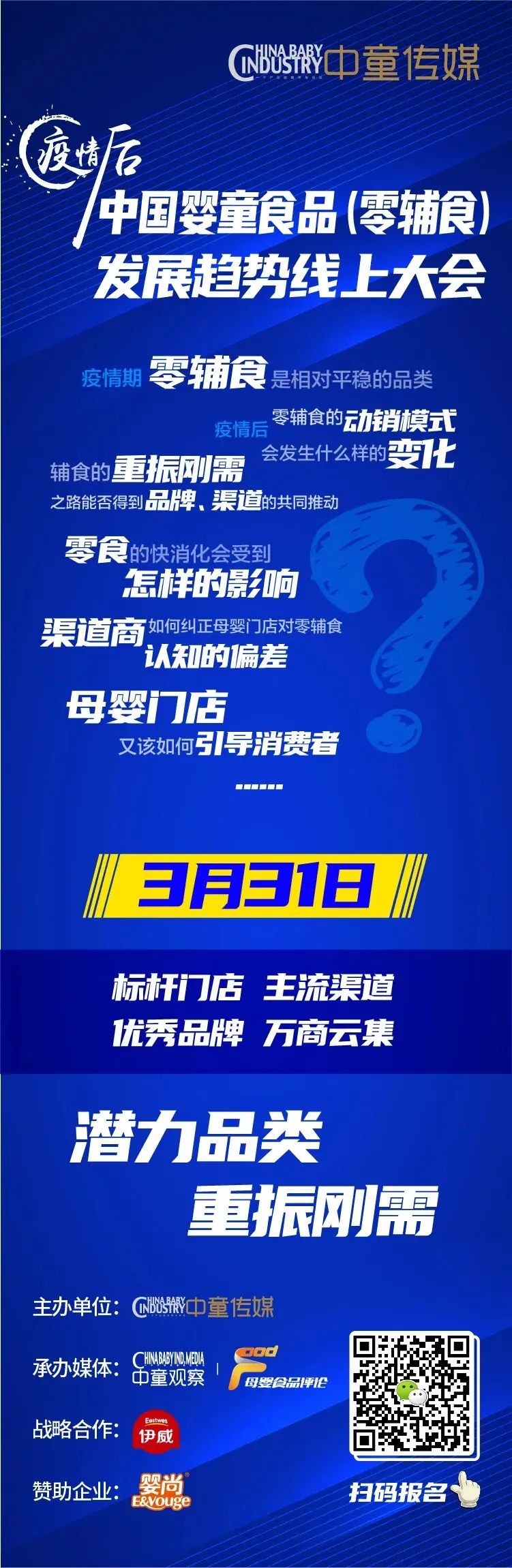 为此,由中童传媒主办,母婴食品评论承办,伊威、婴尚赞助的中国婴童食品(零辅食)发展趋势线上大会将于3月31日震撼来袭!