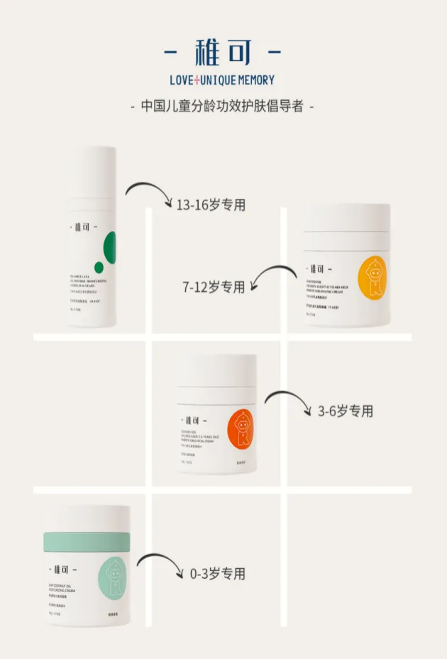 稚可洞察到儿童功效护肤领域的空白,携手国内知名皮肤科专家李远宏教授、刘玮教授,专门针对0-3岁(含3周岁)、3-6岁,7-12岁(含12周岁)、13-16岁儿童及青春期的皮肤特性,满足其安全为核心的护肤需求,打造了中国跨越儿童到青少年的专业分龄功效护肤品牌。
