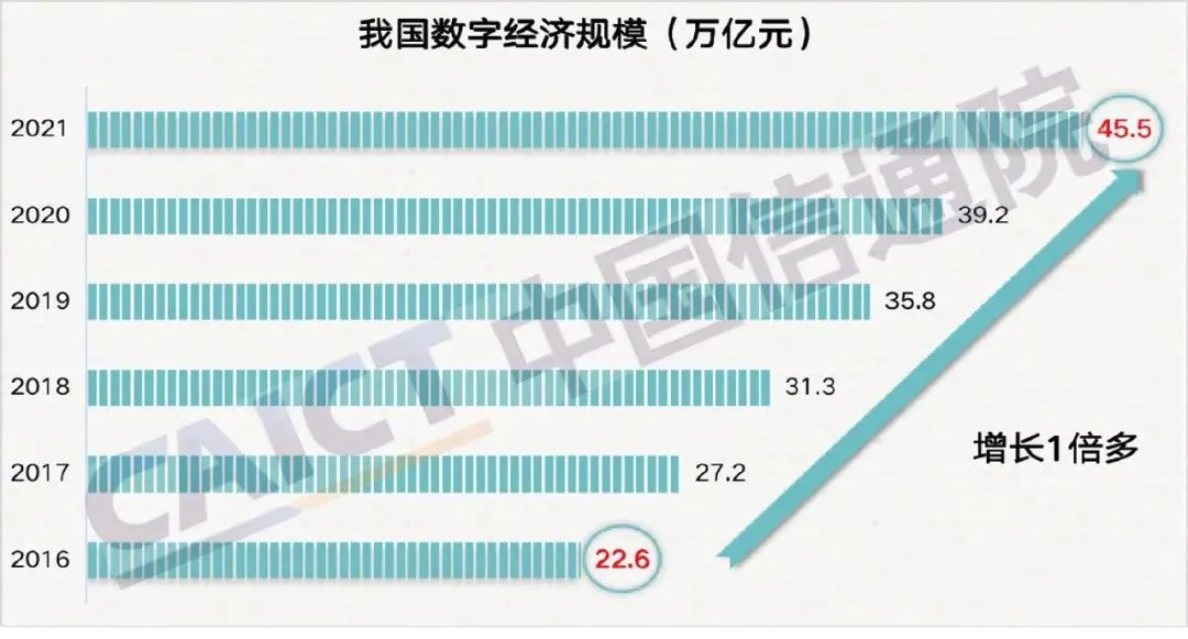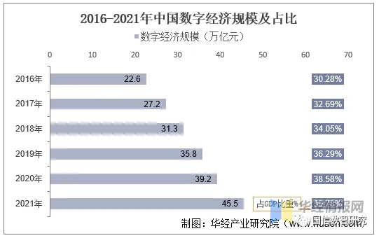 数字经济在我国国民经济中的地位愈发突出。据中国信通院数据,我国数字经济保持较快发展,数字经济规模由2016年的22.6万亿元增长至2021年的45.5万亿元,占GDP的比重也从30.28%提升至39.78%。
