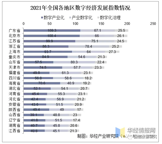 各地在加快推动“十四五”数字经济规划落地。2021年,数字经济发展指数排名前三的省市是广东、北京、江苏,发展指数分别为201.9、200.5、199.5。
