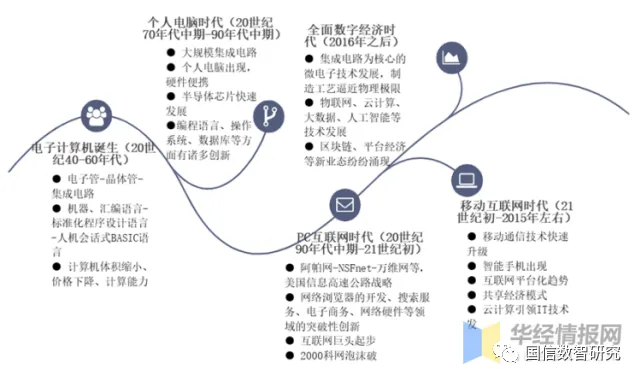 广义上的数字经济发展最早可上溯到20世纪40-60年代,以美国研制出第一台通用计算机埃尼阿克为开端。尽管目前各方研究在时间划分上存在一些差异,但大致都经历了如下几个阶段:
