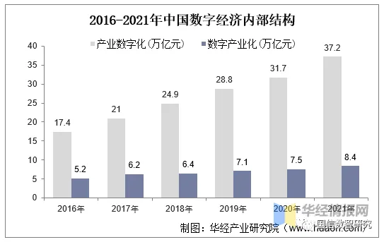 2021年,我国数字产业化规模为8.35万亿元,同比名义增长11.9%,占数字经济比重为18.3%,占GDP比重为7.3%,数字产业化发展正经历由量的扩张到质的提升转变。2021年,产业数字化规模达到37.18万亿元,同比名义增长17.2%,占数字经济比重为81.7%,占GDP比重为32.5%,产业数字化转型持续向纵深加速发展。