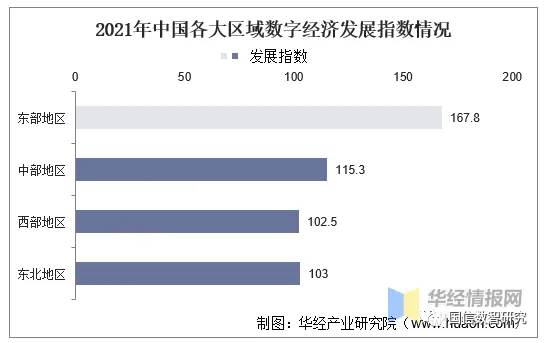 截至2021年底,我国东部、中部、西部、东北地区数字经济发展指数分别为167.8、115.3、102.5和103,数字经济发展不平衡现象仍然存在。