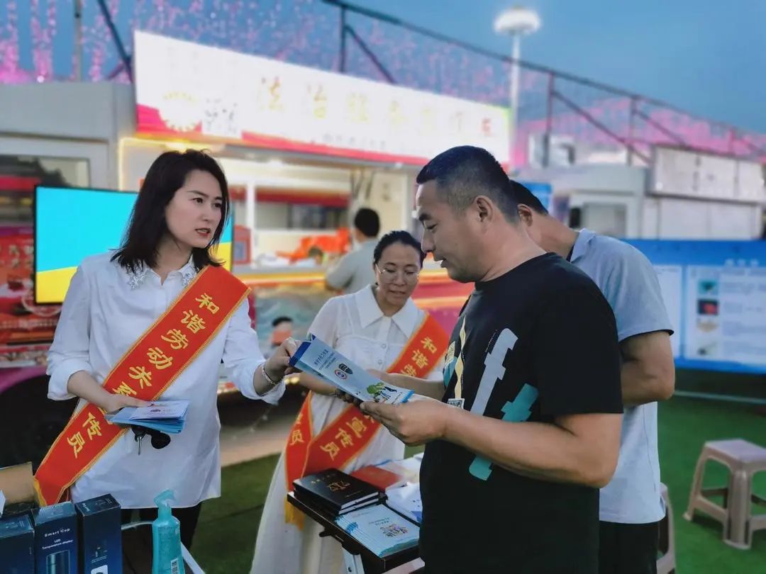8月15日晚7点科尔沁区人力资源和社会保障局联合市局在孝庄河夜市进行普法宣传,宣传《劳动法》《劳动合同法》等法律法规,同时为现场的群众进行解答。