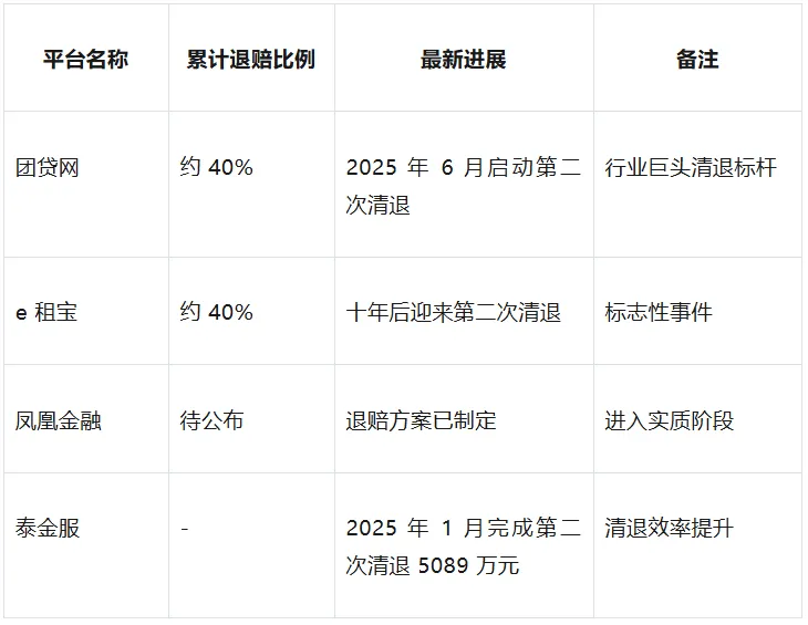 清退工作呈现出明显的分化特征。表现优异的平台如洛安沪金累计退赔达 40%,投哪网在 2025 年 2 月的清退中比例达到约 38.76%。而部分平台如唐小僧仅从最初的 6% 追加至 9%,钱多多虽被查封 350 套房和近 17 亿元资产,实际退赔仅 17%。