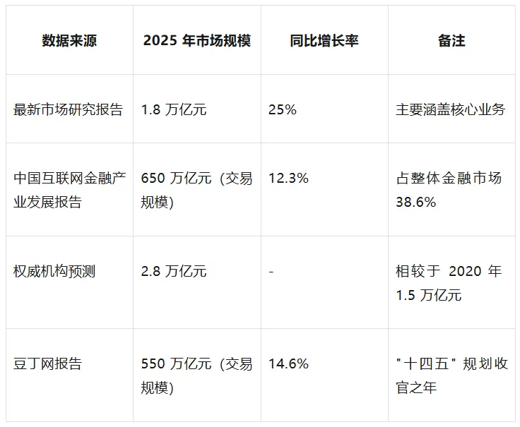 2025 年中国互联网金融行业市场规模呈现出多元化增长态势。根据不同统计口径,市场规模数据存在一定差异: