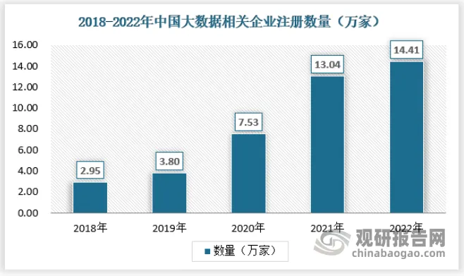 随着我国大数据产业的快速发展,相关企业注册量也随之迅速增长。数据显示,我国大数据企业注册量由2018年的2.95万家迅速增长至2022年的14.41万家,年均复合增长率达48.67%。
