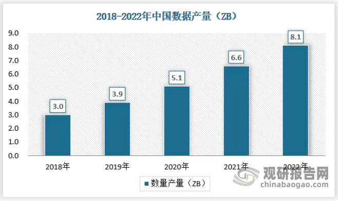 2022年,我国数据产量达8.1ZB,同比增长22.7%,在全球占比为10.5%,居世界第二。截至2022年底,我国数据存储容量规模超1000EB;其中数据存储量达724.5EB,占全球数据总存储量的14.4%。