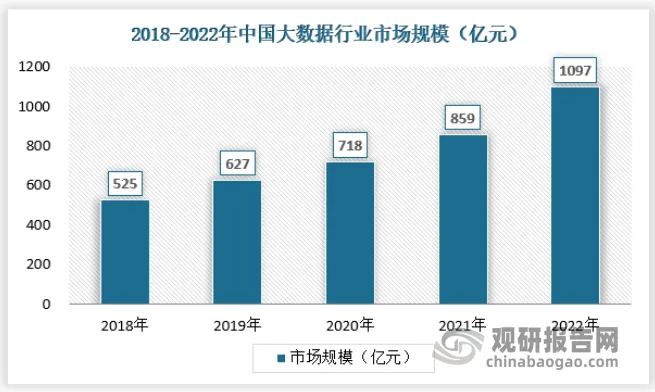 中国大数据市场规模由 2018 年的525亿元增长至 2022年的 1097亿元,复合年增长率达到20.23%。在后疫情时代,中国经济率先复苏并总体保持恢复态势,伴随国家快速推动数字经济、数字中国、智慧城市等发展建设,未来大数据行业对经济社会的数字化创新驱动、融合带动作用将进一步增强,应用范围将得到进一步拓宽,大数据市场也将保持持续快速的增长态势。