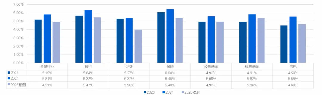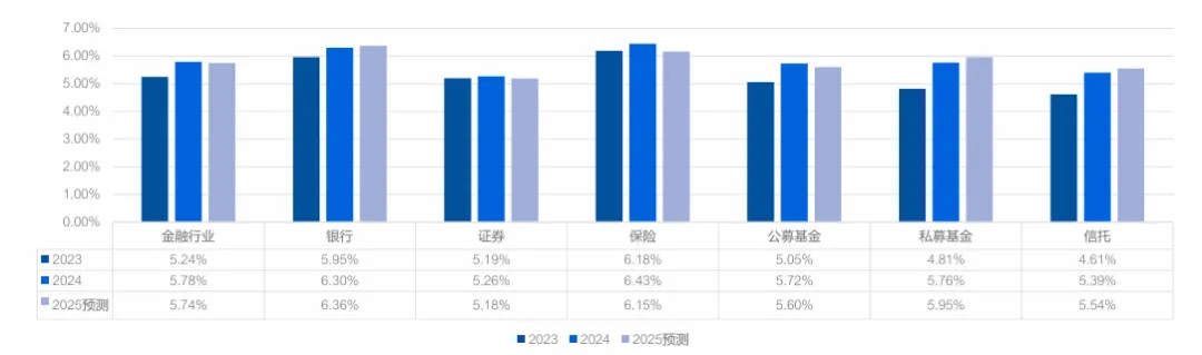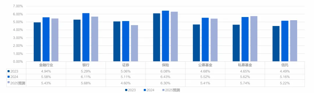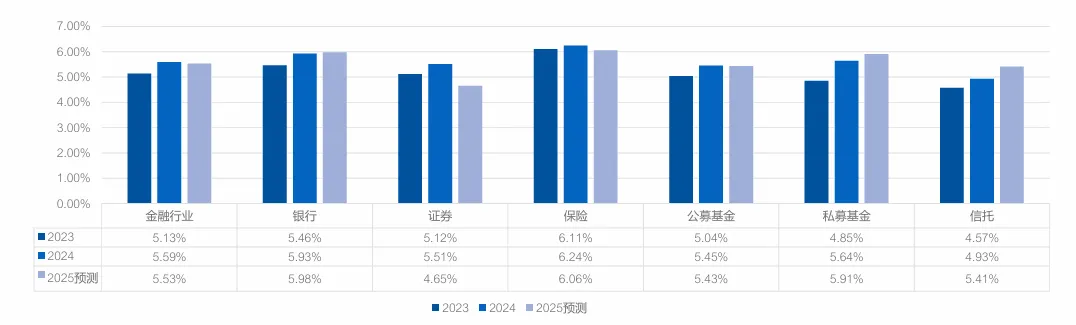 整体薪酬增长率:5.59% 细分亮点:保险行业以 6.24% 的增速居首,主因区域保险市场需求增长(如健康险、养老险),代理人团队激励优化;银行(5.93%)、私募基金(5.64%)紧随其后,银行零售业务增长带动客户经理薪酬提升; 平缓领域:信托行业增速最慢,仅 4.93%,受业务规模收缩影响,薪酬预算趋于谨慎; 2025 年预测:整体降至 5.53%,保险(6.06%)、私募基金(5.91%)仍为增长主力,证券行业预计降至 4.65%。