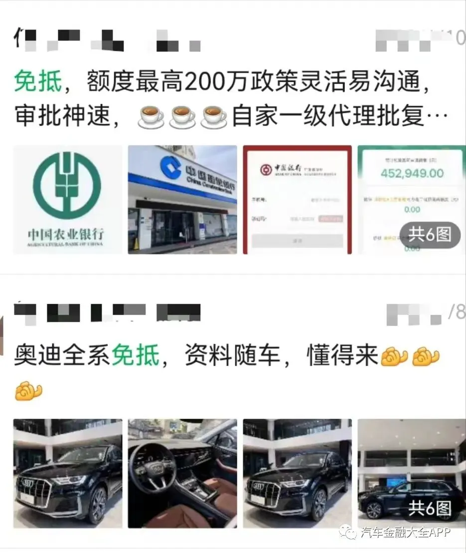 今天去拜访同行,聊到了不少行业动态,当下新车金融市场有不少的免抵押产品,尤其是今年,很多银行杀入新车领域。如下图的农业银行、建设银行、中国银行都有免抵押产品。