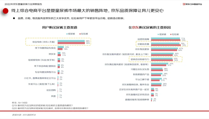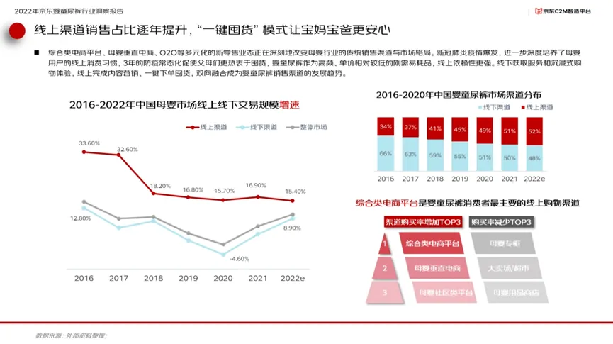 报告显示,2022年中国婴童尿裤市场渠道分布上,线上渠道占比已经超过线下渠道达到52%,而以京东为代表的综合类电商是婴童尿裤消费者最主要的线上购物渠道。