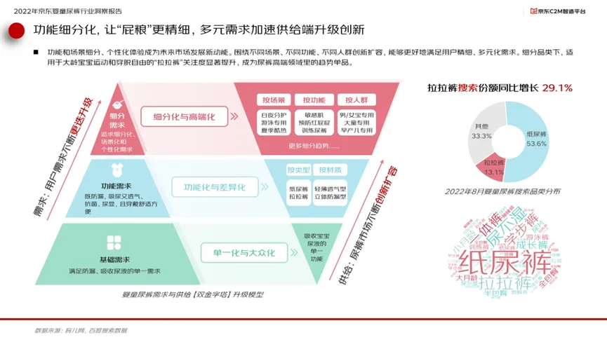 在产品细分赛道方面,功能和场景细分、个性化体验成为未来市场发展新动能。围绕不同场景、不同功能、不同人群创新扩容,能够更好地满足用户精细、多元化的需求。细分品类下,适用于大龄宝宝运动和穿脱自由的“拉拉裤”关注度显著提升,成为高端尿裤领域里的趋势单品。报告显示,2022年8月,“拉拉裤”关键词搜索份额同比提升29.1%。让“屁粮"更精细,多元需求加速供给端升级创新。