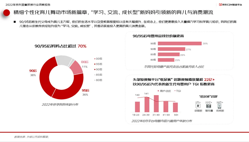随着90/95后新生代父母成为育儿主力军,他们的生活水平以及受教育程度较以往有大幅提升,在观念上,他们更愿意投入大量精力学习科学育儿知识,妈妈们的育儿理念从依赖传统经验升级为“学习、交流、成长型”,并推动家庭投入更高的育儿消费金额。这些个性化的育儿方式也激活了市场新篇章,95后父母在母婴用品的月支出占到了家庭月收入的30%。