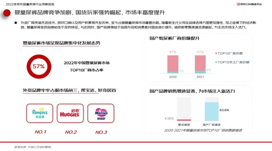 面对市场空间的变化,国内婴童尿裤品牌竞争加剧。其中外资厂商凭借先进技术、良好口碑以及用户积累等先发优势,至今占据婴童尿裤市场重要份额。一方面,随着新生代父母在品牌选择方面更加理性,加之疫情下的经济影响,婴童尿裤也呈现出品牌粘性不足的特征。与此同时,得益于品质升级和消费者对国货信心的提升,国货品牌借助新零售渠道迅速崛起,为主流市场注入活力。报告显示,本土头部厂商份额从2020年的5%迅速提升至2021年的8%,而国产厂商销售额年增速则达到63.6%,远超行业整体增速的4.9%。