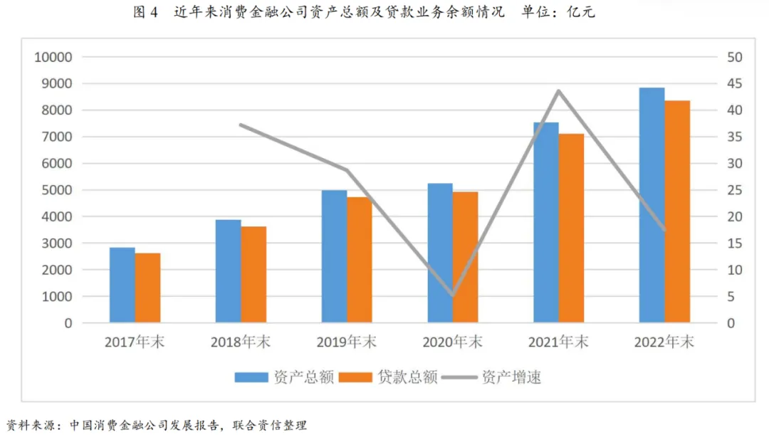 随着资产端业务规模的持续增长,我国消费金融公司资产规模保持增长趋势,2022年消费金融公司资产增速相较2021年疫情短暂缓解时有所下降,但增速高于2020年疫情初期。从结构看,由于消费金融公司主营业务为消费信贷业务,故贷款规模在资产总额中占有较高比重。根据报告披露数据显示,截至2022年末,我国消费金融公司资产总额为8844.41亿元,较上年末增长17.46%。此外,根据公开信息披露显示,截至2022年末,招联消费金融资产总额为1643.46亿元,兴业消费金融资产总额为763.02亿元,2023年6月末蚂蚁消费金融和马上消费金融资产总额分别为1971.04亿元和676.73亿元,而2022年末蒙商消费金融资产总额为47.91亿元,唯品富邦消费金融资产总额仅为3.76亿元。结合以上数据看,随着部分消费金融公司增资扩股,权益和资产规模相应提高以及头部消费金融公司经营期间持续发挥自身头部效应优势,行业内不同消费金融公司资产规模两极化分化较大,头部效应显著。