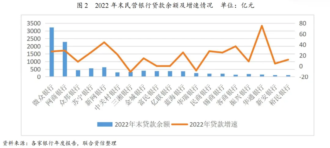 民营银行提供的消费金融服务与互联网金融平台及消费金融公司类似,以现金贷产品为主,目前全国共有19家民营银行,截至2022年末民营银行资产总额达1.78万亿元,其中微众银行和网商银行资产规模超过4000亿元,远超于其他民营银行,资产规模处在前列的4家民营银行资产规模总额占全部民营银行资产总额的63.38%,分化态势明显。业务模式方面,微众银行、网商银行、新网银行和亿联银行4家银行是纯线上经营,除上述4家备案为全线上展业的民营银行外,其余民营银行经营范围均被限制在当地,营业网点单一、业务发展一定程度上有所受限。上述互联网贷款相关政策对除全线上展业的4家民营银行以外的其他15家民营银行开展信贷业务产生较大限制,2022年绝大部分民营银行贷款增长率较2021年末有所下降,且个别民营银行降幅明显甚至出现贷款余额下降的情况(见图2)。