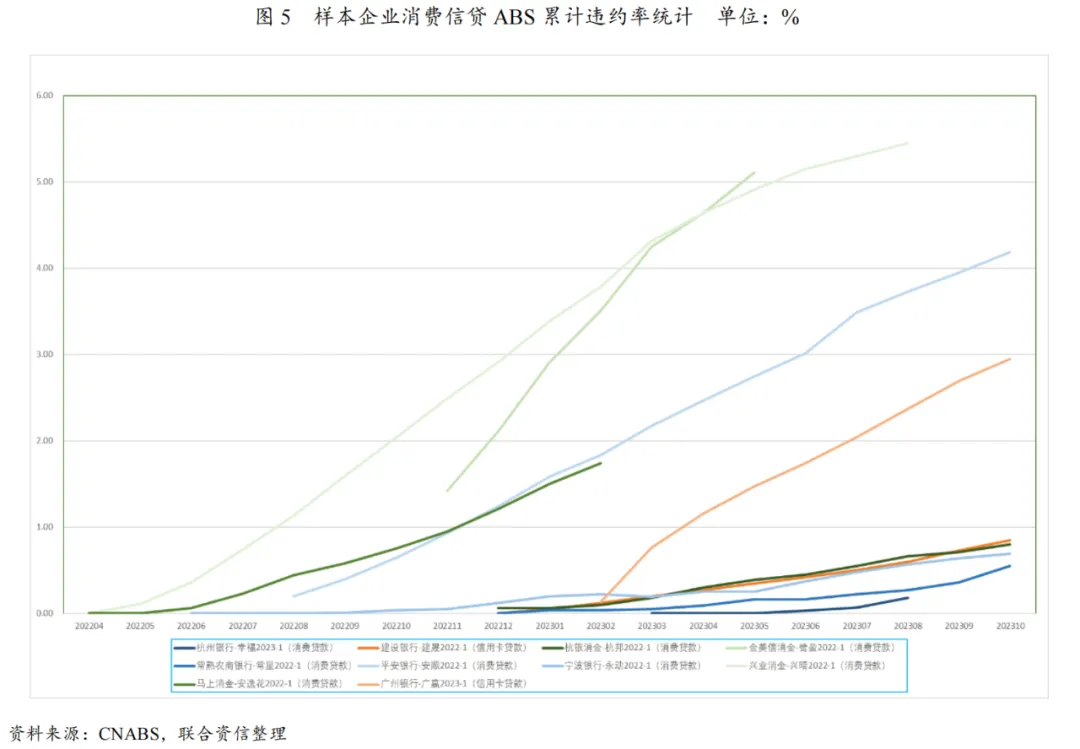 在线上业务转型加快的同时,消费金融公司数字化、智能化的风控特征愈加明显。由于消费金融公司定位于中低收入客群,基本以信用贷款为主,风险成本较高,同时获客渠道上主要依赖于互联网平台第三方引流模式,因此独立自主的风控能力建设是竞争的关键因素。从资产质量表现来看,截至2022年末,我国消费金融公司不良贷款余额为185.24亿元,较上年末增长23.58%,略高于贷款余额增速(2021年不良贷款余额增速为26.46%,远低于贷款余额增速的44.21%);平均不良贷款率为2.22%,较上年末略有上升,这或与疫情期间各家消费金融公司有相应的延期还本付息、展期等政策,使得信用风险的暴露有一定的滞后性、五级分类标准趋严以及短期内资产规模增速放缓,无法通过业务规模增长稀释风险管理水平所致,但整体信贷资产质量相对稳定。从拨备水平看,一是由于不良贷款规模的上升,二是结合监管对于“鼓励拨备水平较高的大型银行有序降低拨备率”的要求,消费金融公司顺势相应政策,2022年末拨备覆盖率降至271.49%,但仍处于较高水平,具有较强的风险抵补能力。从消费金融市场重要参与主体的对比分析来看,由于数据可获得性,本文选取了2022年以来银行间市场发行的消费信贷ABS产品中可获得累计违约率期数较长的10家机构来作为样本,底层涉及银行信用卡贷款、银行个人消费贷款以及消费金融公司个人消费贷款三类。根据样本企业图5的累计违约率曲线,不同类型发起机构的消费贷款的资产质量表现呈现一定分化,优良程度从高到底排序依次为商业银行个人消费贷款、商业银行信用卡贷款、消费金融公司个人消费贷款,整体来看商业银行客群较为优质,从累计违约率曲线来看呈现缓慢上升趋势并处于较低水平,而消费金融公司定位中长尾客户,客群更加下沉,从累计违约率来看上升幅度较快且整体处于较高水平。