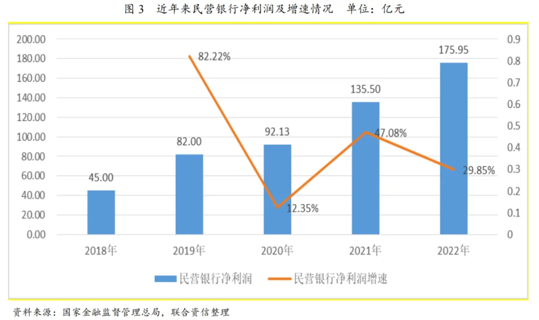 从净利润看,近年来民营银行净利润保持增长,且成立前期由于业务规模快速扩张净利润达到较高增速,但2022年以来随着互联网贷款新规实施、贷款端业务受限、叠加部分民营银行资本补充受限等因素影响,净利润增速有所下降。其中,微众银行和网商银行2022年净利润分别为89.37亿元和35.38亿元,占民营银行整体净利润的70.76%,微众银行净利润占比超过50%,头部效应显著,尾部经营压力较大,且有部分民营银行净利润水平有所下降,业绩分化明显(见图3)。