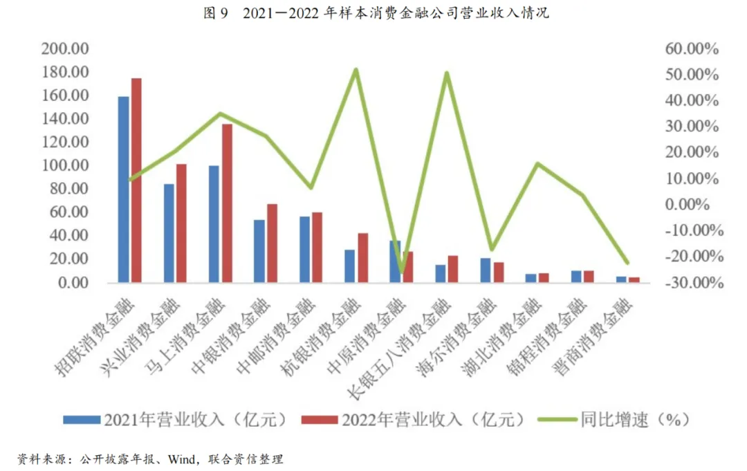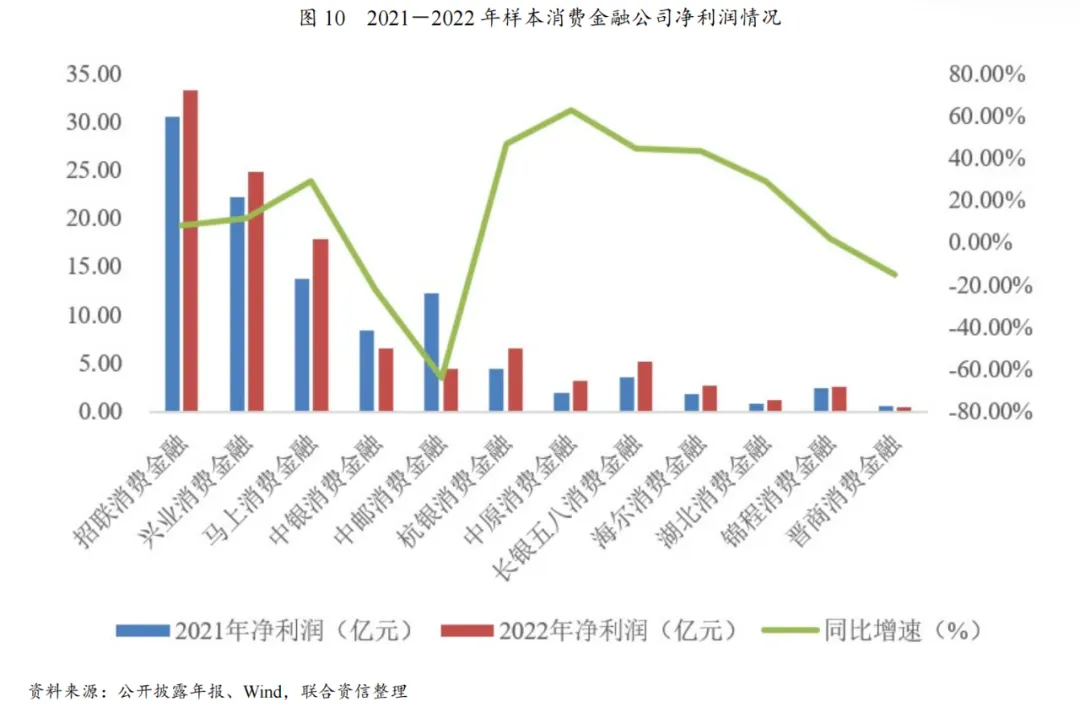本文选取了12家公开信息披露相对详细的消费金融公司作为样本(以下简称“样本消费金融公司”)。2022年,受监管要求消费金融公司将年化综合贷款利率控制在24%以内影响,消费金融行业资产端定价水平面临下行压力,但得益于负债端资金成本有所压降,加之资产规模保持增长,营业收入及净利润规模有所提升,行业整体收益水平较高。2022年,样本消费金融公司资产规模较上年末增长14.73%至5718.75亿元,营业收入较上年增长16.58%至671.94亿元,净利润较上年增长5.49%至109.29亿元,ROA及ROE分别为2.04%和17.90%。营业收入方面,2022年,样本消费金融公司营业收入增速介于-25.98%至51.91%,增速差异较大;大部分样本消费金融公司营业收入实现正增长,6家机构营业收入增速在15%以上。营业支出方面,消费金融公司营业支出主要由信用减值损失构成,信用减值损失对净利润的影响既来源于信贷资产质量的变化情况,同时也与公司自身拨备水平存在一定关系。综合营业收入和净利润数据来看,2022年,招联消费金融、兴业消费金融、长银五八消费金融和锦程消费金融的信用减值损失对盈利实现的负面影响相对较小。净利润方面,2022年,全部样本消费金融公司均实现盈利,其中招联消费金融、兴业消费金融和马上消费金融的净利润规模明显高于其他机构,行业头部效应表现仍较为明显;大部分样本消费金融公司的净利润增速较快,这与消费金融行业规模效应逐步显现、资产质量基本稳定、拨备水平适度降低,以及部分消费金融公司因规模较小而存在低基数效应有一定关联。另一方面,部分消费金融公司净利润下滑的原因为宏观经济增长承压背景下消费客群还款能力弱化导致减值损失计提力度上升。收益率方面,2022年,样本消费金融公司中ROE高于20%的机构共有3家,分别是兴业消费金融、长银五八消费金融和招联消费金融,马上消费金融ROE为19.76%,排名紧随其后,均处于较好水平。