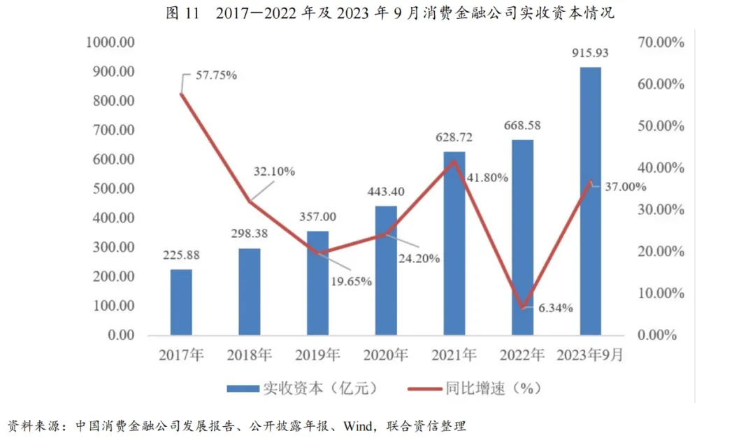目前,利润留存仍为消费金融公司的主要资本补充渠道。截至2023年6月末,样本消费金融公司股东权益合计715.90亿元,较上年末增长8.22%;所有样本消费金融公司股东权益均实现增长,大部分机构股东权益增长主要依靠利润留存,增幅与净利润基本一致。增资扩股方面,2023年,有4家消费金融公司增资到位,实收资本得到不同程度的提升。其中,南银法巴消费金融实收资本由6亿元增至50亿元;尚诚消费金融实收资本由10亿元增至16.24亿元;宁银消费金融实收资本由9亿元增至29.11亿元;蚂蚁消费金融实收资本由80亿元上升至185亿元,成为目前实收资本最高的消费金融公司,同时其注册资本增至230亿元的方案已获得监管批复。受上述因素影响,叠加建信消费金融于2023年6月正式开业(实收资本为72亿元),2023年9月末31家消费金融公司实收资本合计915.93亿元,较上年末增长37.00%,增速同比明显提升。此外,多家消费金融公司公布了增资扩股计划。其中,锦程消费金融注册资本拟增至10亿元,苏银凯基消费金融注册资本拟增至42亿元。考虑到股东增资流程周期较长、增资进程变数较大等情况,未来仍需对各家消费金融公司增资款项落实情况保持关注。资本类债券发行方面,监管支持消费金融公司通过公开发行二级资本债券的方式进行资本补充。目前,招联消费金融已获得发行不超过22亿元二级资本债券的批复,中邮消费金融已获得发行不超过18亿元二级资本债券的批复,但尚未有机构成功发行二级资本债券。值得注意的是,近期颁布的《非银行金融机构行政许可事项实施办法》明确了非银行金融机构资本类债券储架发行机制,消费金融公司等机构可在批准额度内,自主决定具体工具品种、发行时间、批次和规模,并于批准后的24个月内完成发行,在资本工具募集发行结束后10日内向决定机关报告,这将有助于消费金融公司拓展资本补充渠道,缓解资本补充压力。