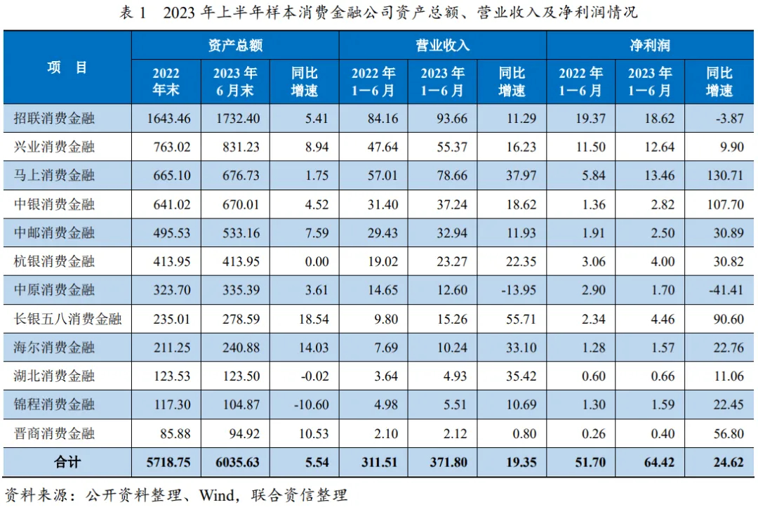 2023年以来,受居民消费信贷需求扩张影响,消费金融公司资产规模持续上升,整体营业收入及净利润同比明显增长,盈利能力有所提升,但需关注宏观经济弱复苏背景下长尾客群还本付息能力变化对消费金融行业利润实现的影响。截至2023年6月末,样本消费金融公司资产规模为6035.63亿元,较上年末增长5.54%;除锦程消费金融资产规模出现下滑,杭银消费金融和湖北消费金融资产规模同比变化不大外,其余样本消费金融公司资产规模均有所提升。营业收入方面,2023年1-6月,样本消费金融公司实现营业收入371.80亿元,同比增长19.35%,增速高于上年全年水平;12家样本消费金融公司中有10家营业收入增速在10%以上,但亦有个别消费金融公司营业收入延续下降趋势或增长乏力。净利润方面,2023年1-6月,样本消费金融公司实现净利润64.42亿元,同比增长24.62%,增速明显高于上年全年水平;大部分样本消费金融公司净利润显著增长,马上消费金融和中银消费金融的净利润增速均超过100%,长银五八消费金融的净利润增速达90.60%,这或与2023年上半年消费行业回暖带动贷款规模增长有关。考虑到宏观经济仍处在弱复苏周期,且消费金融公司所服务的客群相对下沉,需关注信贷资产质量变化及减值损失计提对盈利带来的不利影响。此外,2023年下半年,市场流动性趋紧导致利率中枢抬升,消费金融公司的融资成本或将增加,这或将为其盈利水平提升带来一定压力。