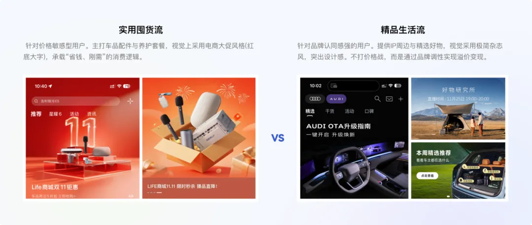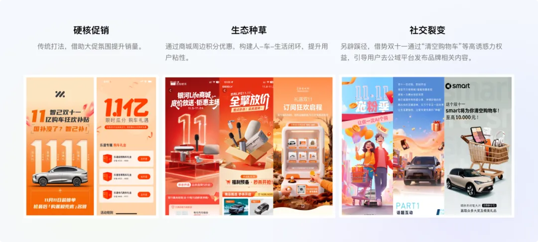 11 月,获客与转化类内容在 APP 首页 Banner 中占比高达 66.8% 。在年底冲量的背景下,各品牌根据自身产品周期(有无新车)和资源禀赋,采取了三种差异化的运营策略:新品造势引流、存量价值挖掘、以及节点促销转化。
