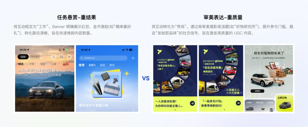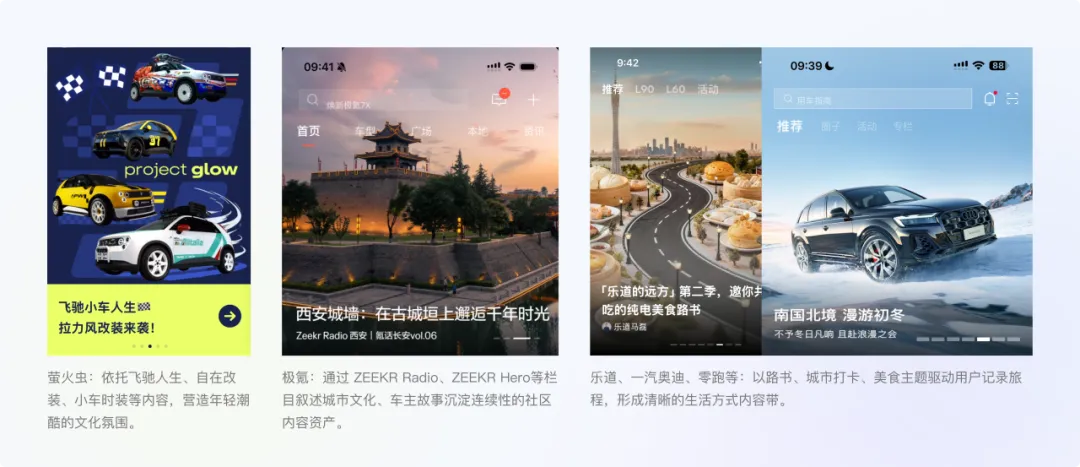 这些品牌将社区视为“第二客厅”,以生活方式内容建立价值链接。主题横跨潮流、改装、街拍、美食、亲子、旅程等场景,强化“自在玩乐”“生活方式”等核心心智。整体特征是从“车中心”转向“生活中心”,以价值观共鸣构建更持久的用户黏性。