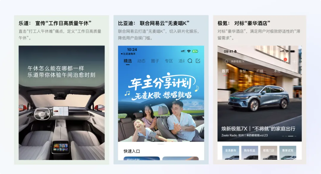 各品牌正在疯狂挖掘“停车状态 ”的商业价值。 这是一个极为重要的信号:随着电车普及,用户在车内的“静止时长”大幅增加。通过具体的微场景(如午休 1 小时),增加用户对车辆作为“第三空间”的感知。越具体的场景,转化率越高。