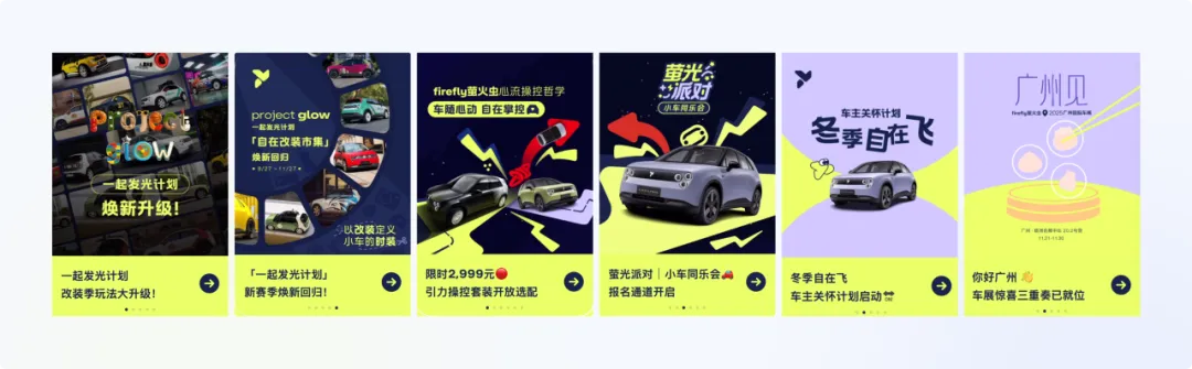 萤火虫:通过高饱和度的色彩撞击、游戏化的视觉元素以及零距离的生活叙事,成功将“多巴胺设计”引入汽车营销。它不再售卖冰冷的“驾驶机器”,而是在贩卖快乐的“情绪玩具”。
