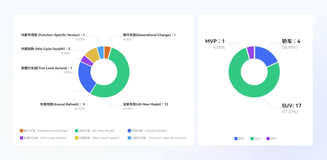 从车型分布看,SUV 以 77% 的绝对优势 碾压轿车与 MPV。但在这一拥挤赛道中,我们观察到了明显的策略分层: