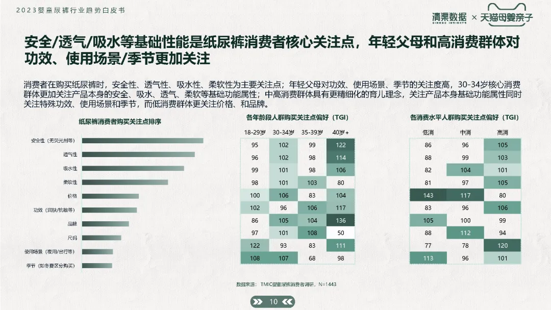 安全透气吸水等基础性能是纸尿裤消费者核心关注点,年轻父母和高消费群体对功效、使用场景/季节更加关注。