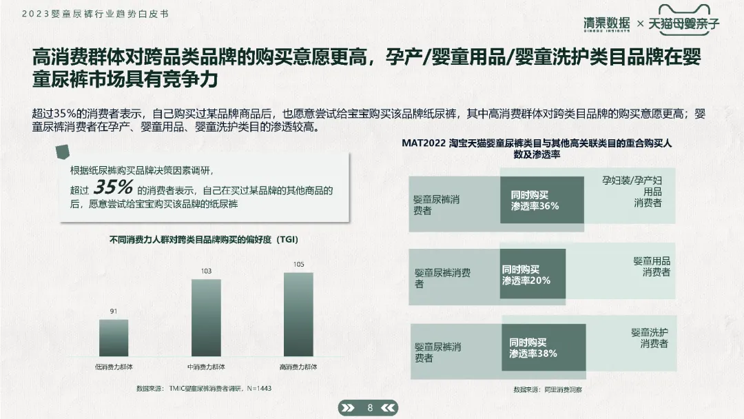 高消费群体对跨品类品牌的购买意愿更高,孕产/婴童用品/婴童洗护类目品牌在婴童尿裤市场具有竞争力。