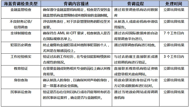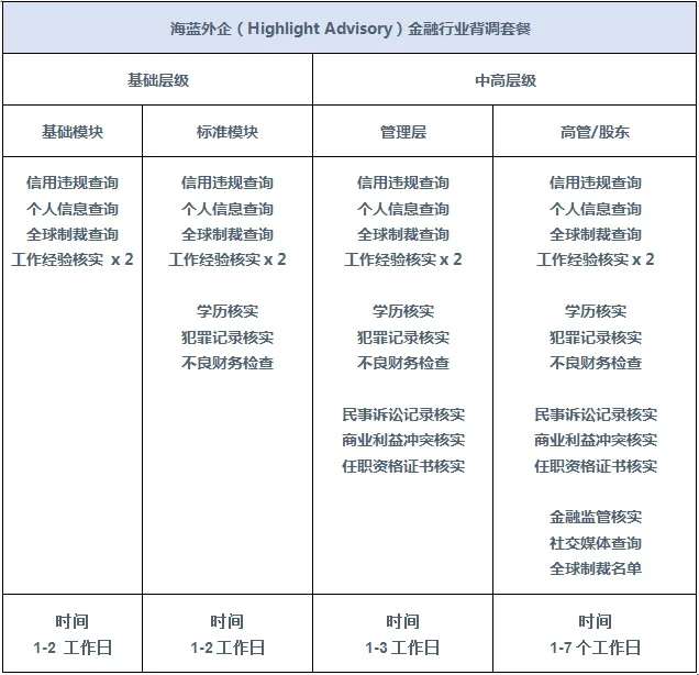 通常金融行业背景调查包括以下类型: