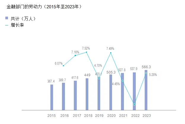 由于金融行业稳健快速发展,从业人员数量也将持续增长。2012年至2020年金融行业从业人员年均增长率为7%,但2020年和2021年分别降至4.45%和1.91%。然而,受惠于优惠政策和金融创新,从业人员增长率迅速恢复至5.28%,金融行业从业人员达到了5,663,000人。预计未来几年金融行业从业人员将继续增长。银行业一直是金融人才最集中的行业,其从业人员数量接近金融行业总人数的一半。然而,随着银行业进入转型期,预计未来几年其人才需求将继续保持低速增长,而保险、证券和基金行业的人才需求预计将继续增长。