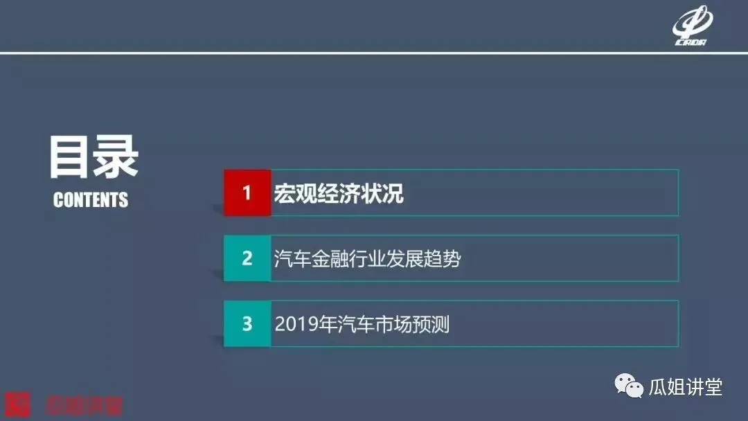 我今天要分享的内容分成三个部分,首先分析一下宏观经济的状况,第二部分分析汽车金融行业的发展趋势,最后是对2019年的汽车市场做出预判。