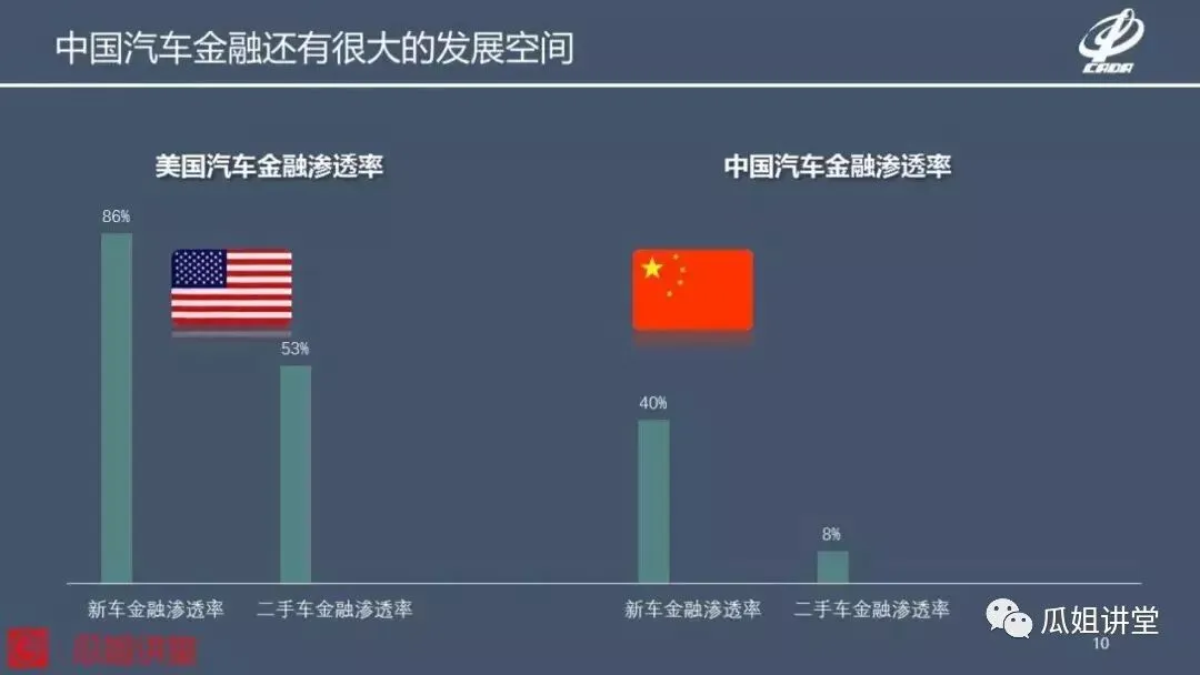 二手车差距就更大了,二手车的金融渗透率现在仍然是个位数,只有8%,而美国二手车的金融渗透率是53%。