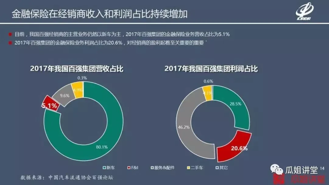 另外看一下经销商集团对于金融保险业务的依赖,红色的这个板块就是金融和保险的这一块,我们可以看到在整个经销商的营收中占比是5%,在利润中的占比达到20%。