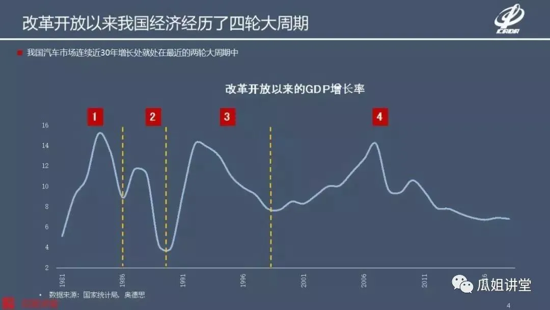 首先看一下宏观经济的情况,中国汽车市场从建国以来经历了十个周期,应该是从第七个周期开始发展的。也就是说我们可以看到从繁荣、复苏到衰退、萧条这样的一个周期。