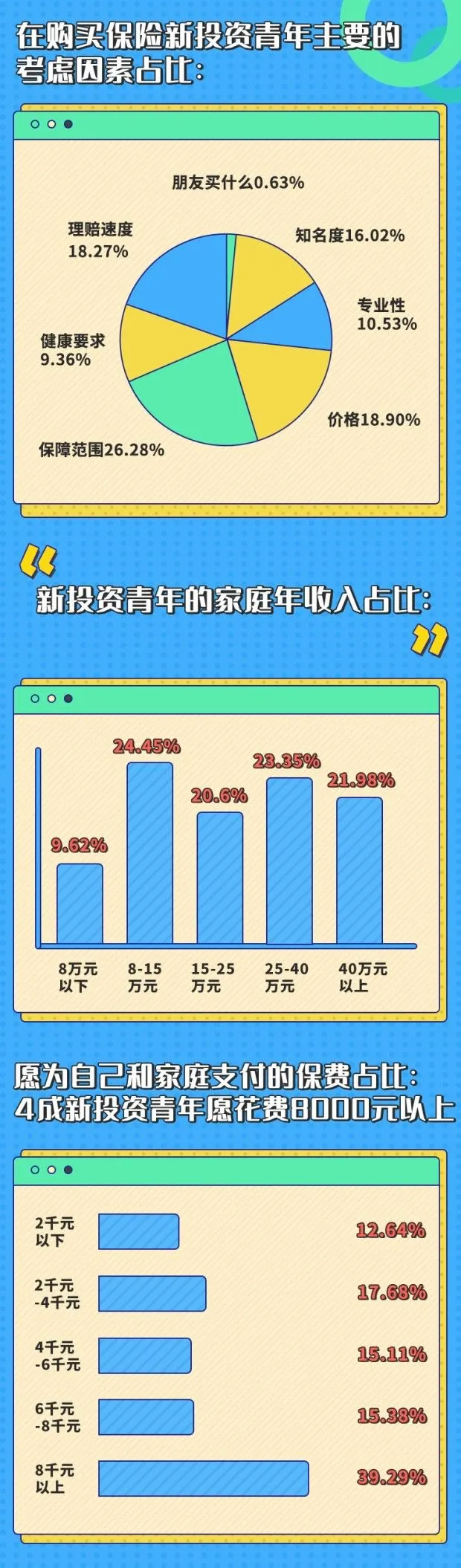 在购买保险时,新投资青年最关心保障范围,价格和理赔速度;对“朋友买什么保险”表示并不关心。