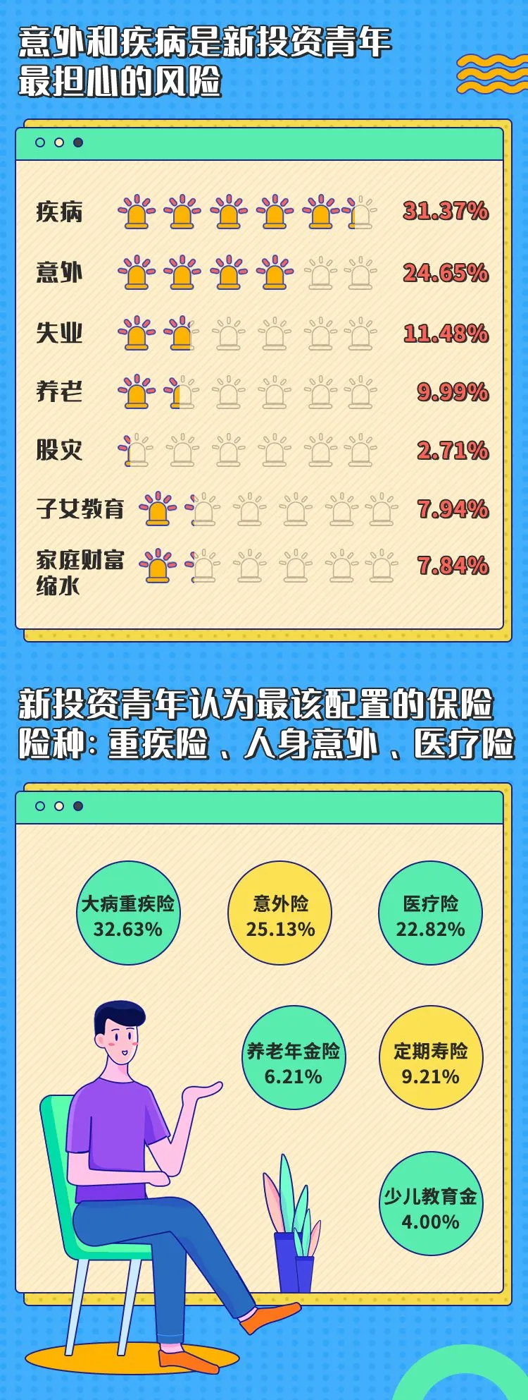 新投资青年最担心的是意外和疾病,这和他们觉得最该配置的前三名保险险种是对应的:大病重疾险,意外险和医疗险。这和前文我国医疗保障的情况相对应:医疗保障仍有较大缺口,新投资青年首选商业健康险为自己筑建抵御风险的围墙。
