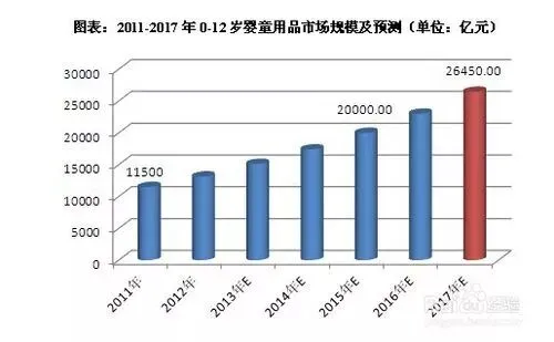 根据前瞻产业研究院数据显示:2011年中国0-12岁的婴童市场总规模约为11500亿元。近几年,婴童市场将保持15%左右的高速增长,到2015年婴童市场将达到2万亿元的规模,预计到2017年,0-12岁婴童市场规模将超过26000亿元。
