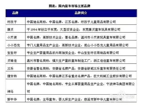 我国近10多年的发展诞生了一大批童车企业,仅制造企业就有上千家之多,主要集中在珠三角、长三角、以及山东河北等几个地区,具有雄厚实力的大型童车企业不在少数。知名品牌的企业如“好孩子”、“小天使”、“神马”、“乐美达”、“智乐堡”、“宝宝好”、“群兴”、“维克斯”、“好来喜”和“佳佳”等。