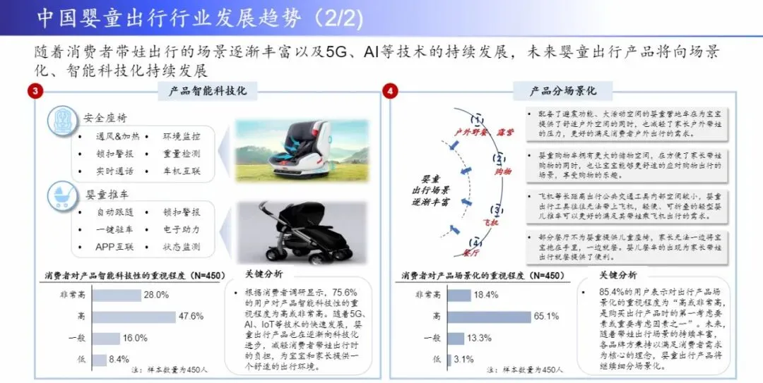 结合消费者调查的数据,白皮书总结了婴童出行行业的发展趋势:各品牌方秉持以满足消费者需求为核心的理念,未来婴童出行产品将持续向着“分龄化”、“高颜值化”、“科技智能化”和“分场景化”发展。